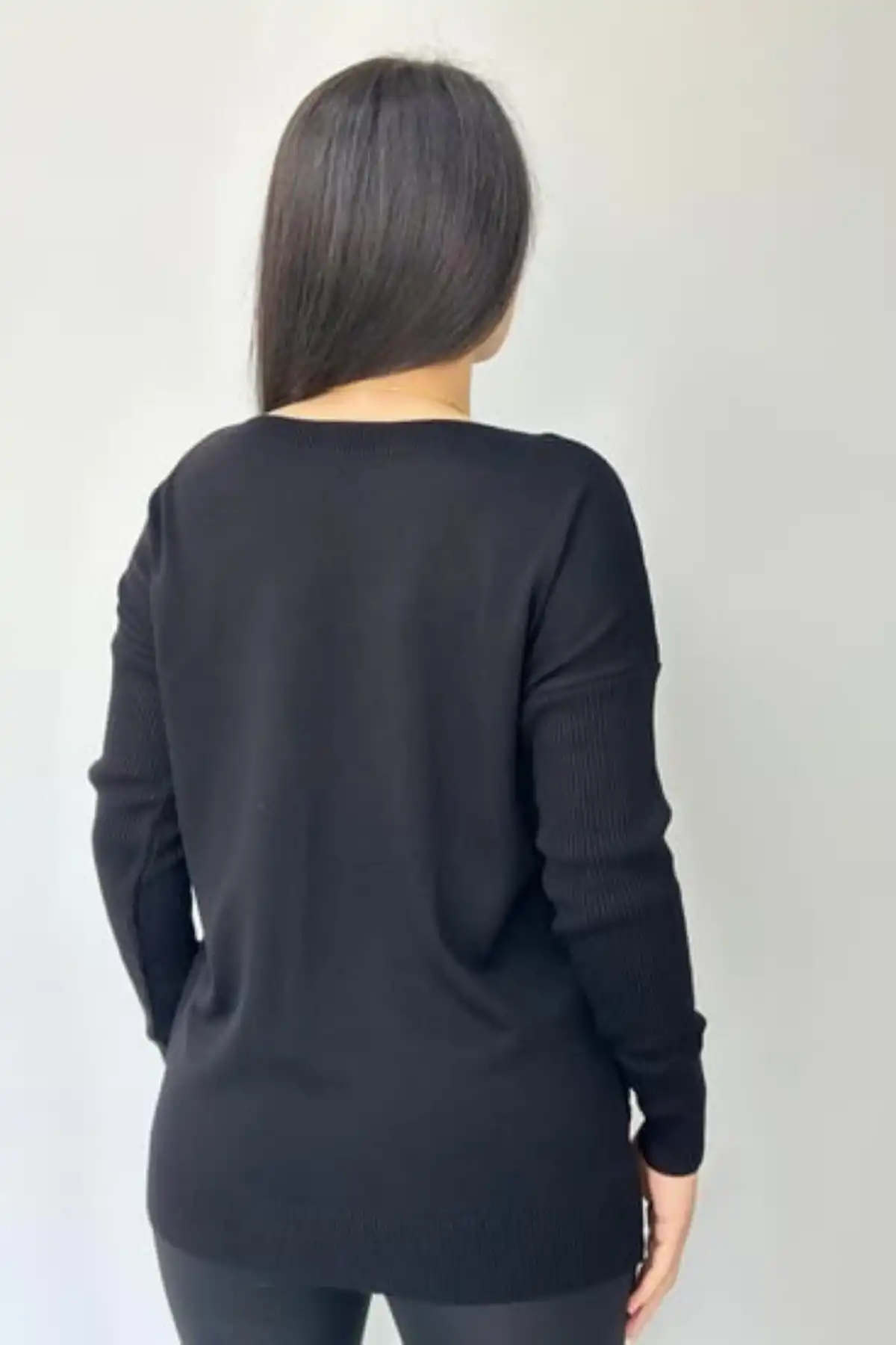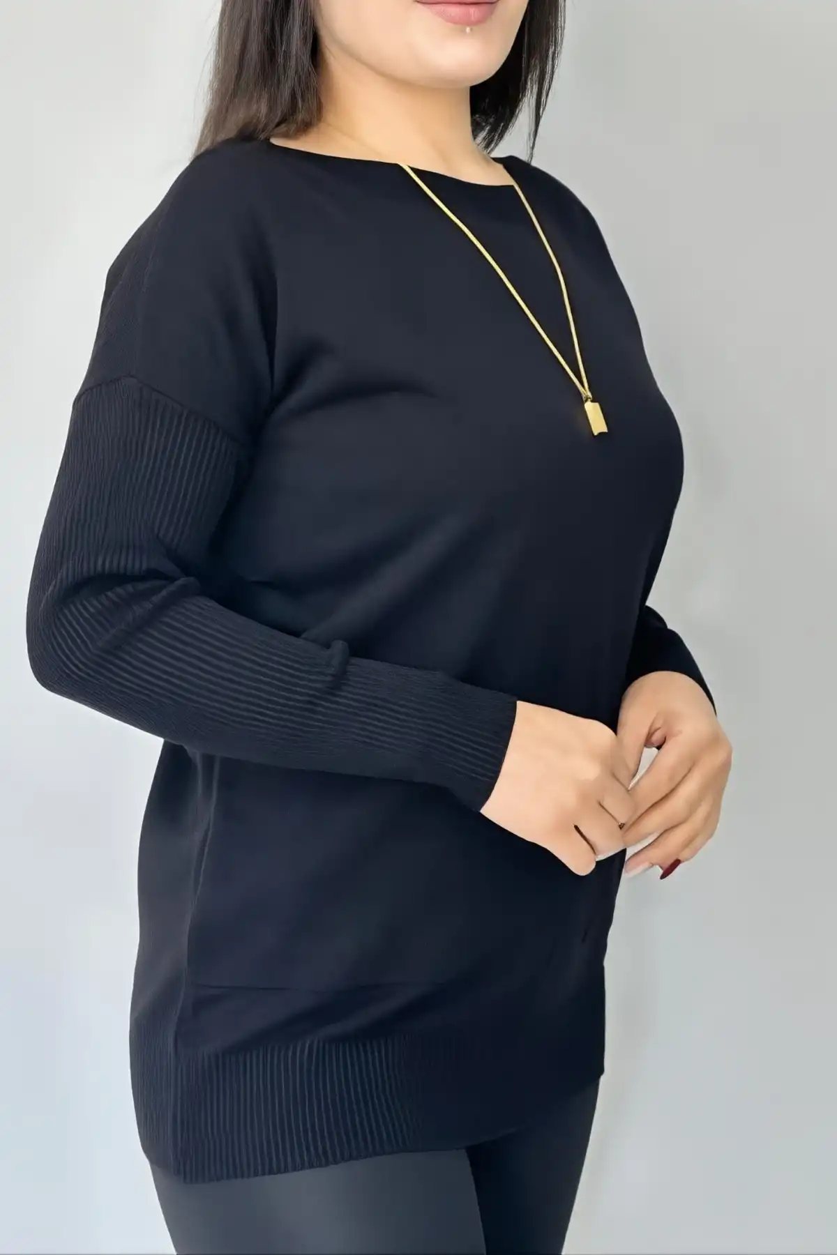 Kadın SİYAH Bisiklet Yaka Yandan Cepli Likralı Yumuşak Dokulu İnce Tiriko Kazak
