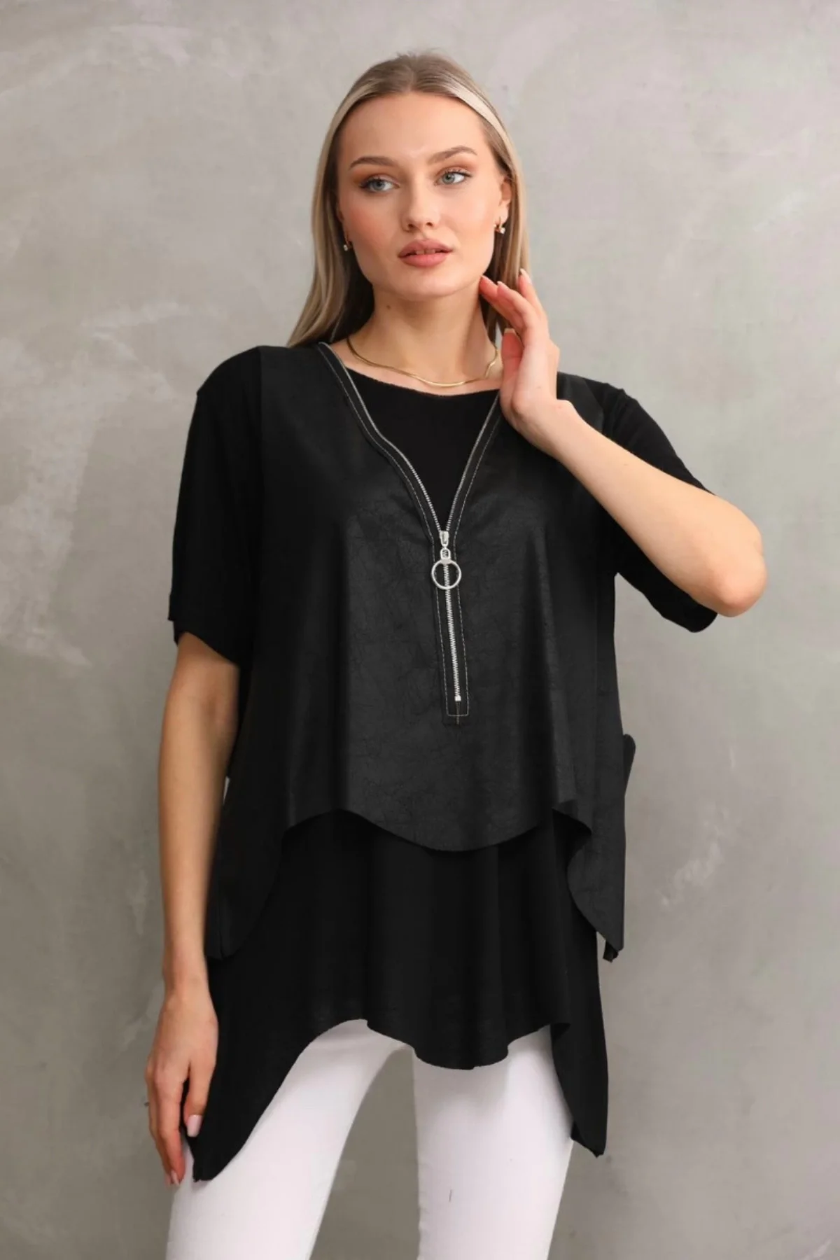 Kadın Büyük Beden Bisiklet Yaka Eteği Kol Ucu Ve Yakası Detaylı Likralı Pamuk Viskon Penye Bluz
