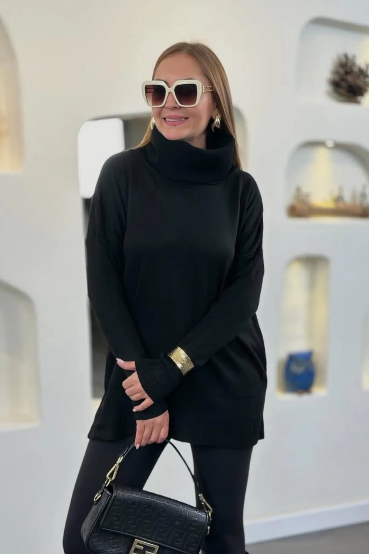 Kadın SİYAH Degaje Yaka Yandan Cepli Likralı İnce Triko Bluz