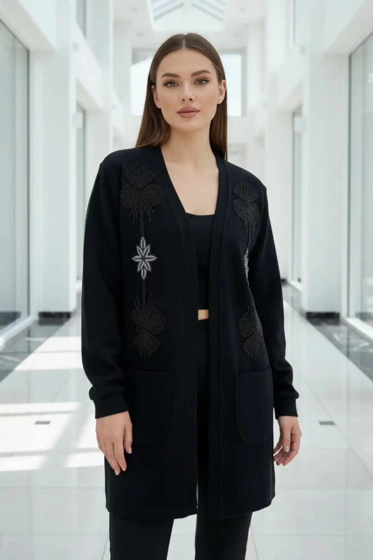 Kadın Siyah Palmiye Boncuk İşlemeli Selanik Kumaş Cepli Ceket