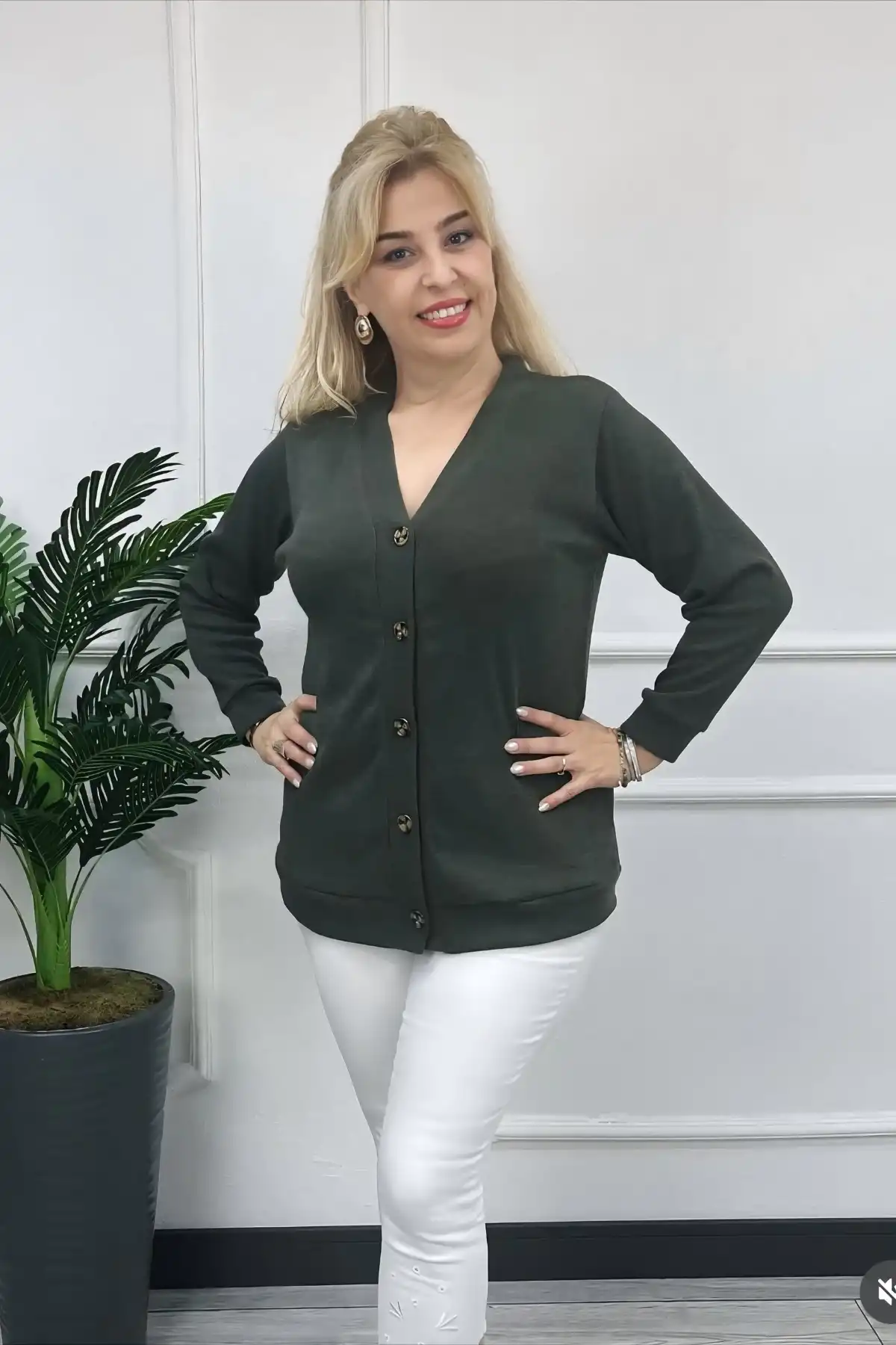 Kadın Haki Yeşil Düğmeli Huviz Kumaş Likralı İnce Titiko Hırka