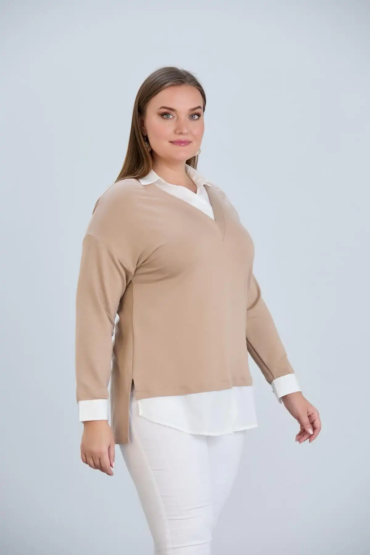 Kadın Bej İçten Gömlek Yaka Çıkmalı Düz Garnili Yeni Sezon Kristal Likralı Kumaş Buluz