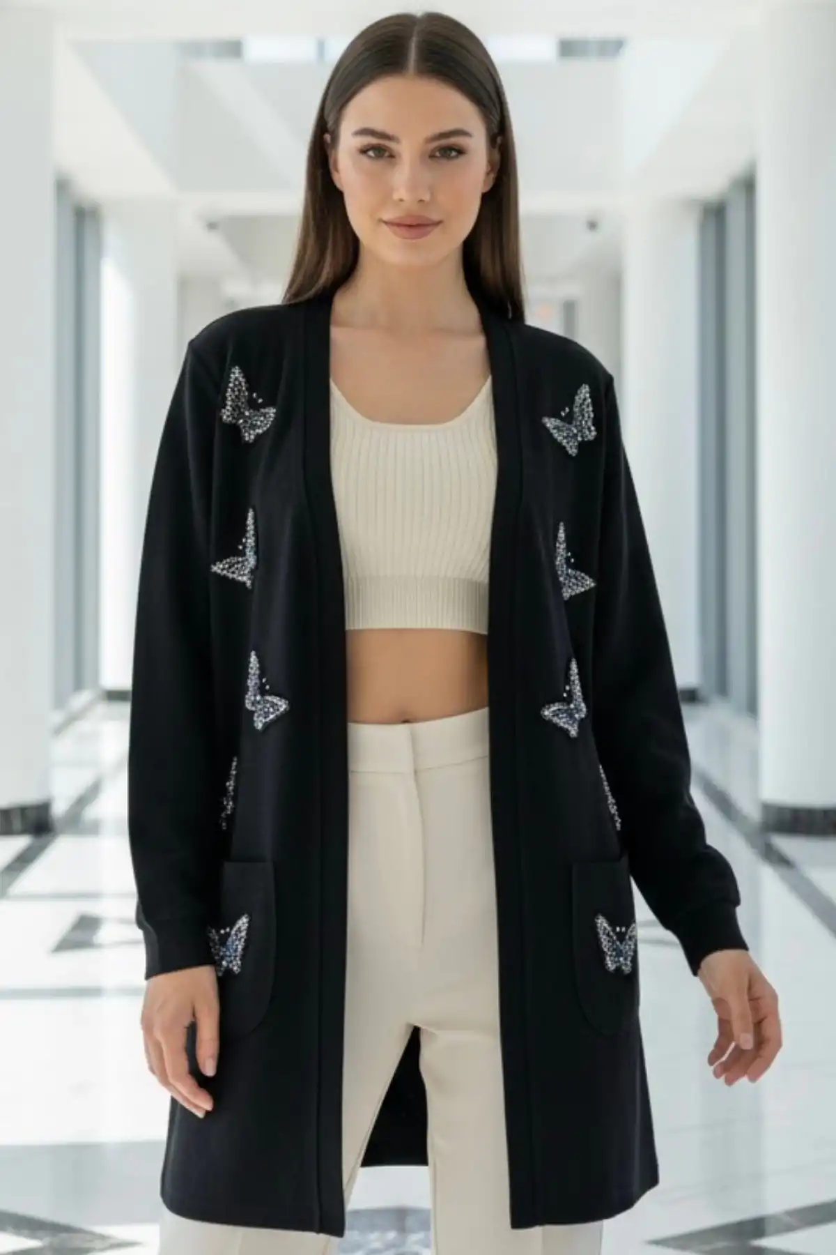 Kadın Sİyah Kelebek Boncuk İşlemeli Selanik Kumaş Cepli Ceket