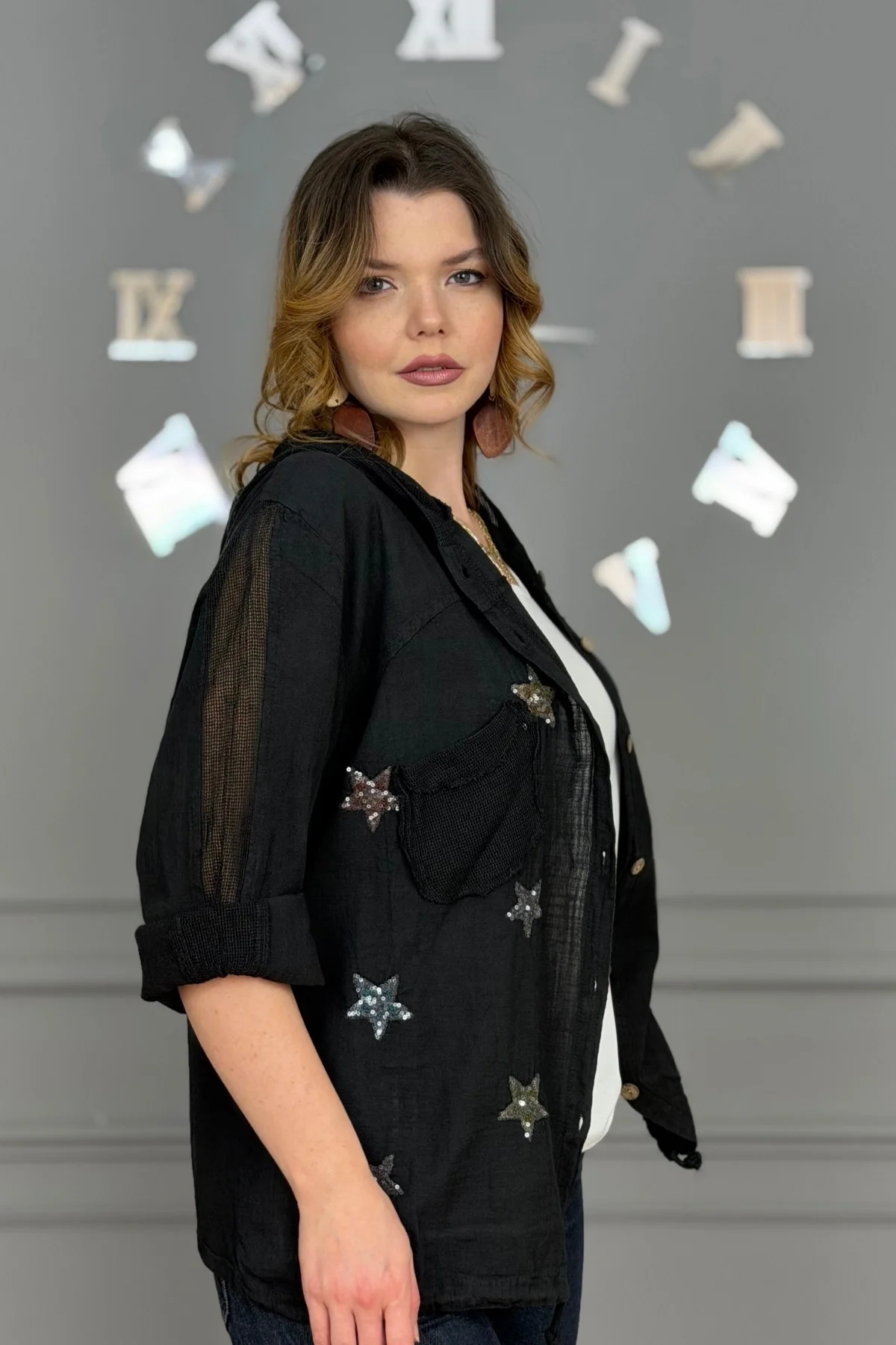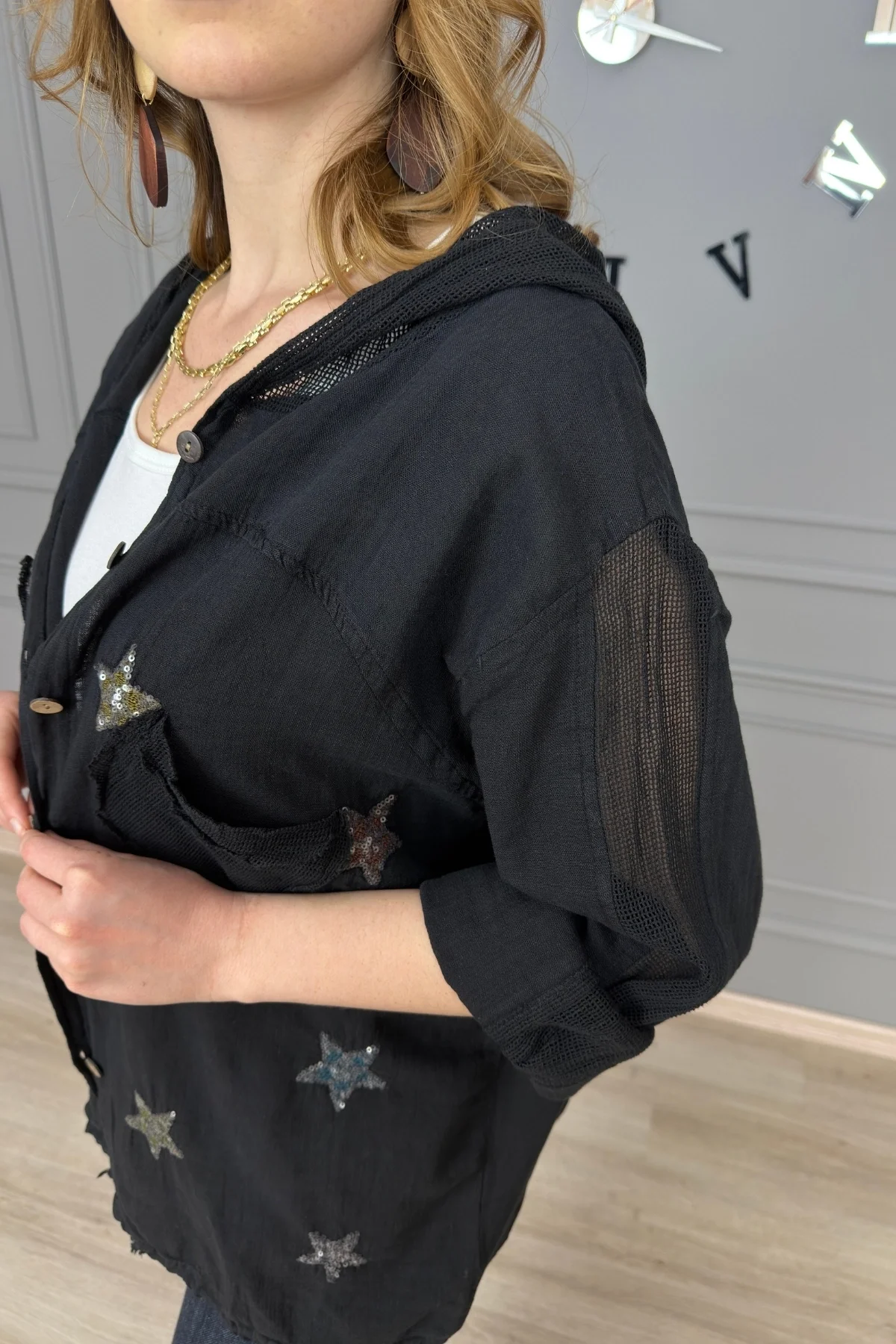 Kadın Siyah Organik Yıkamalı Keten Kumaş Arkası Pamuk Penye Kapüşonlu File Ve Yıldız Pul Nakışlı Gömlek Ceket