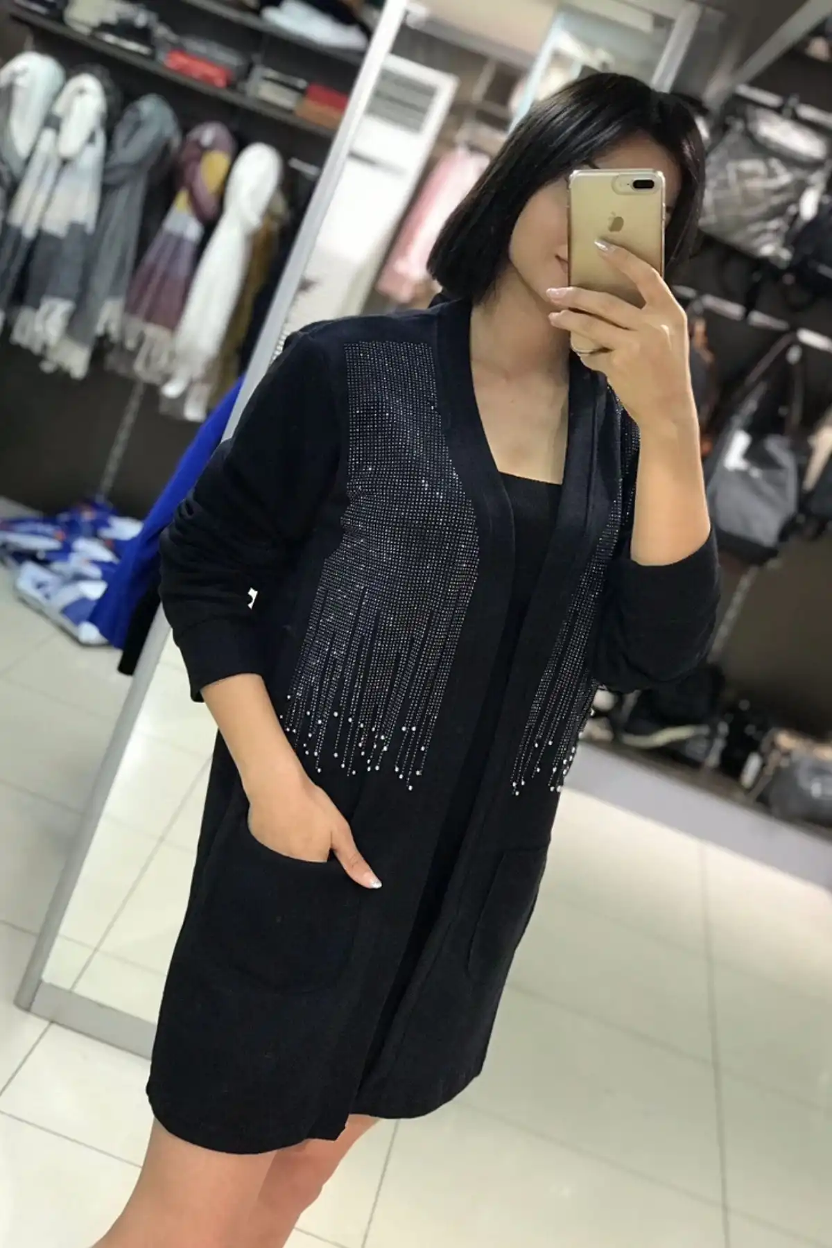 Kadın Siyah Selanik Kumaş Serpme Taş Deteylı Hırka
