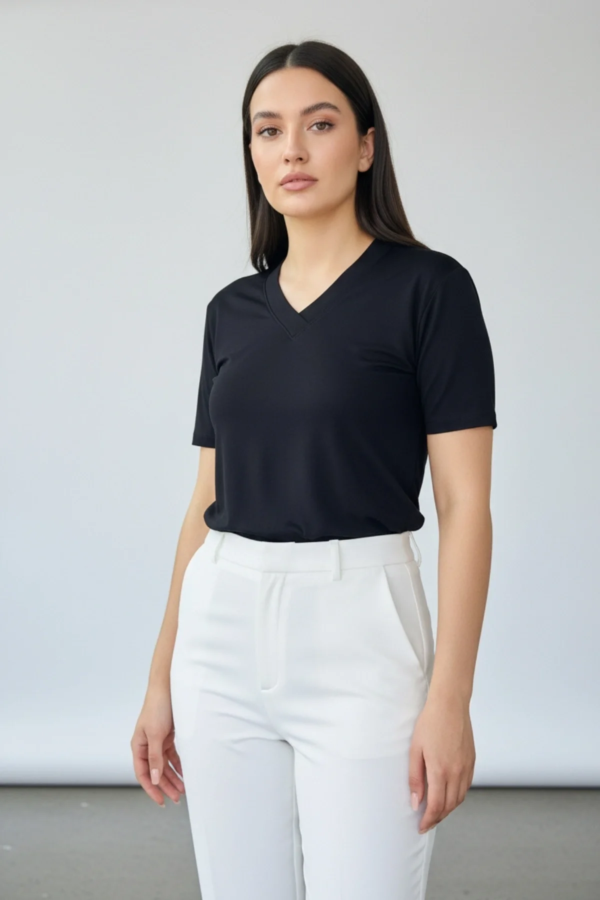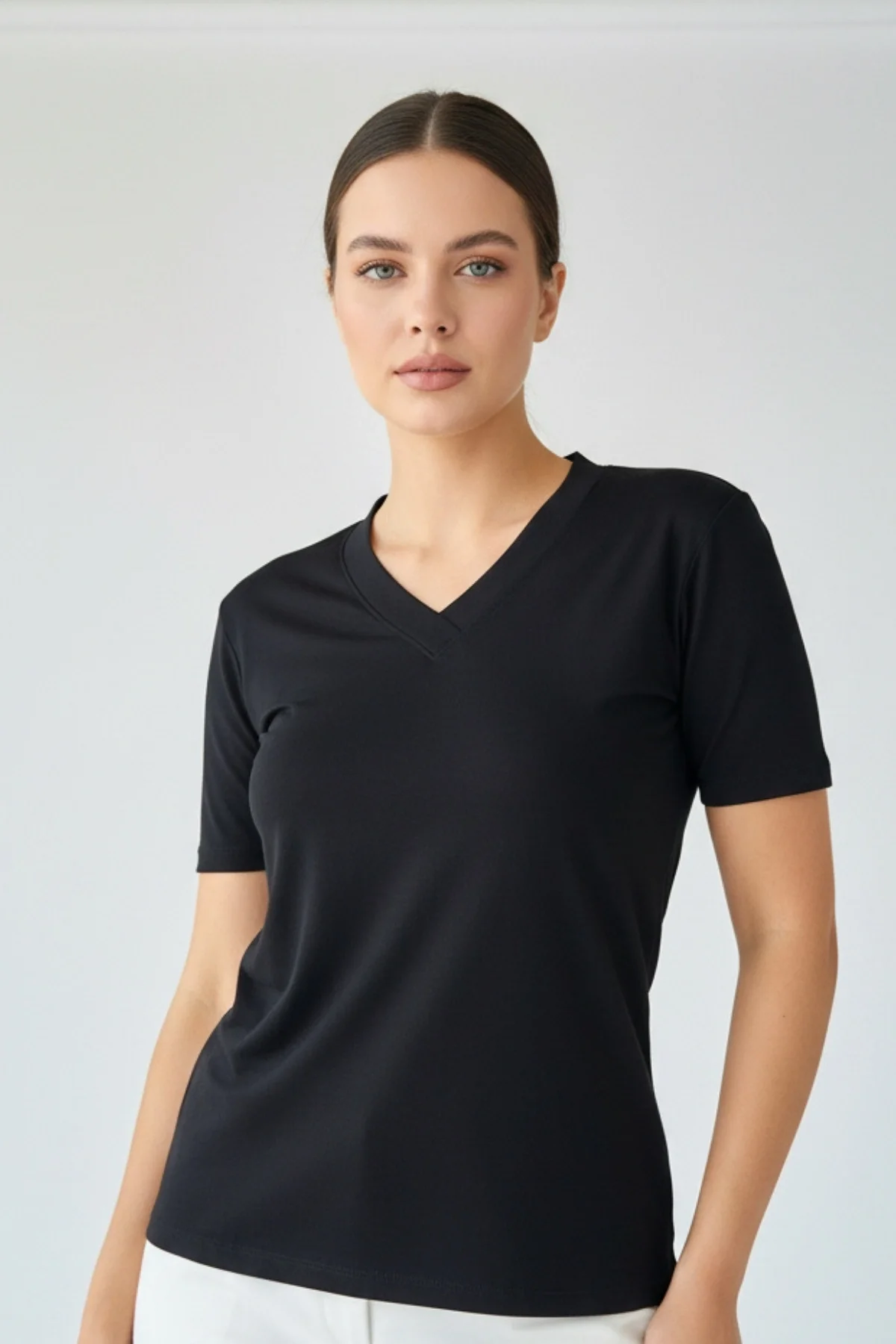 Kadın Siyah V Yaka Kısa Kol Likralı Pamuk Vizkon Kumaş Bluz