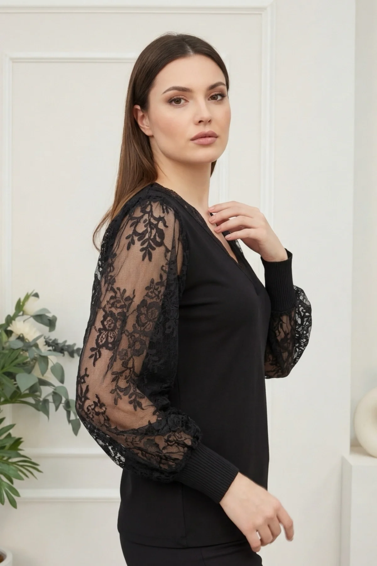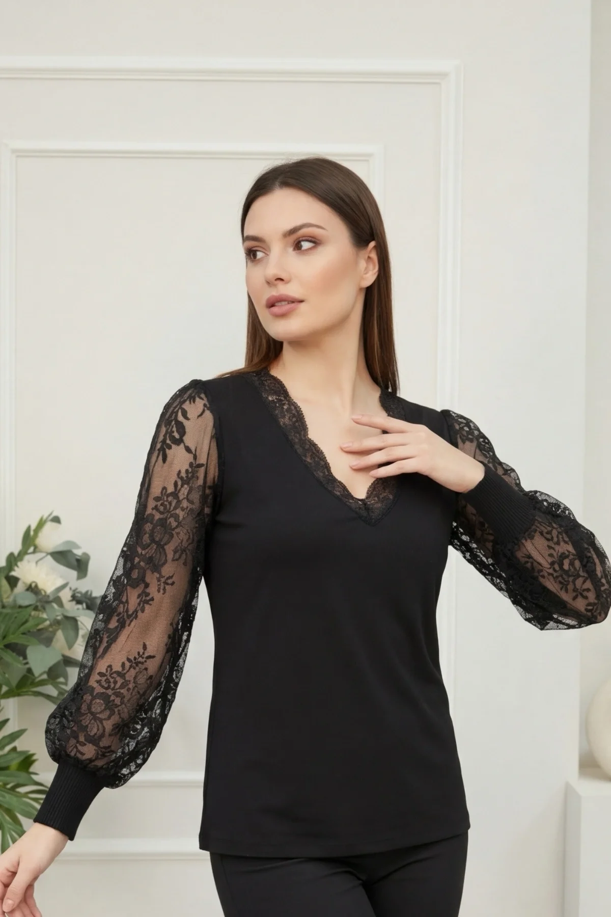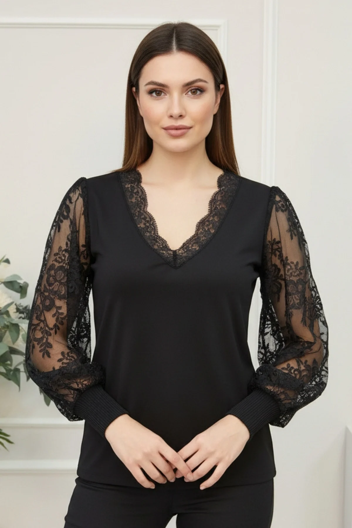 Kadın Siyah V Yaka Kollar Tül Yaka Dantelli Likralı Bluz