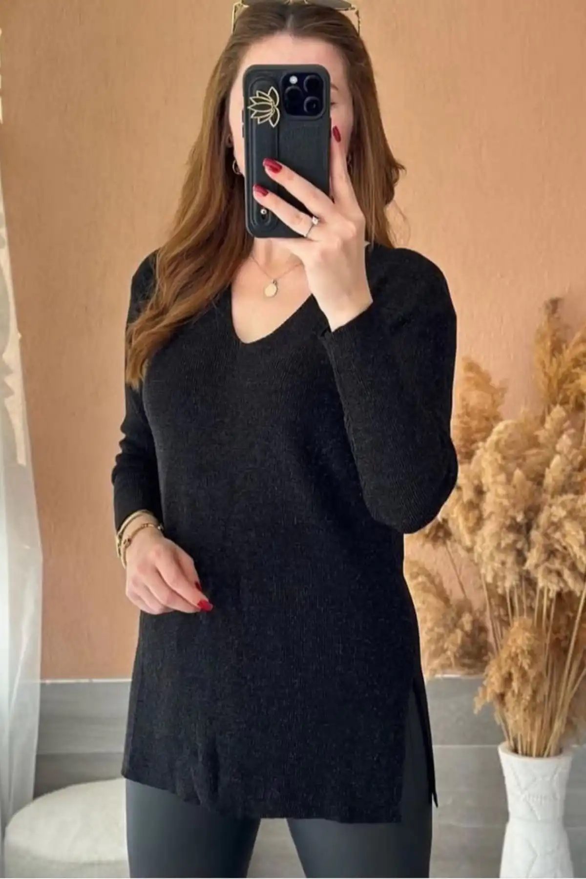 Kadın Siyah V Yaka Likralı Dışı Simli İçi Yumoş İnce Triko Bluz