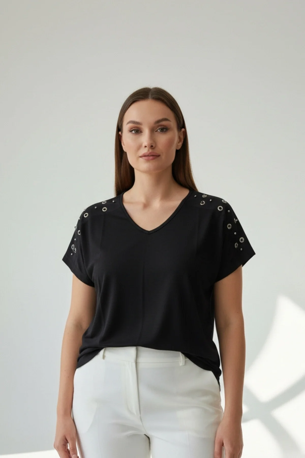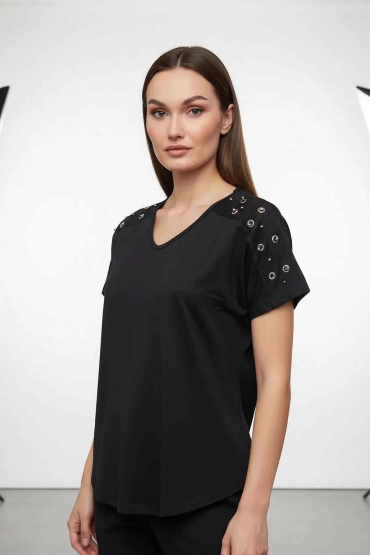 Kadın Siyah V Yaka Omuzlar Kuşgözlü Zımbalı Likralı Pamuk Viskon Penye Kumaş