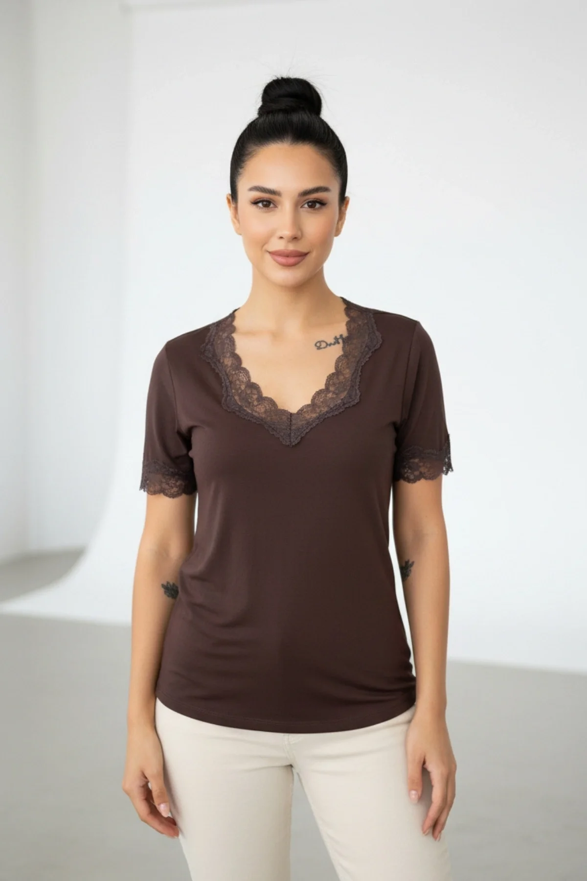 Kadın KAHVE V Yaka Yakası Ve Kol Ucu Dantelli Likralı Esnek Kısa Kol Bluz