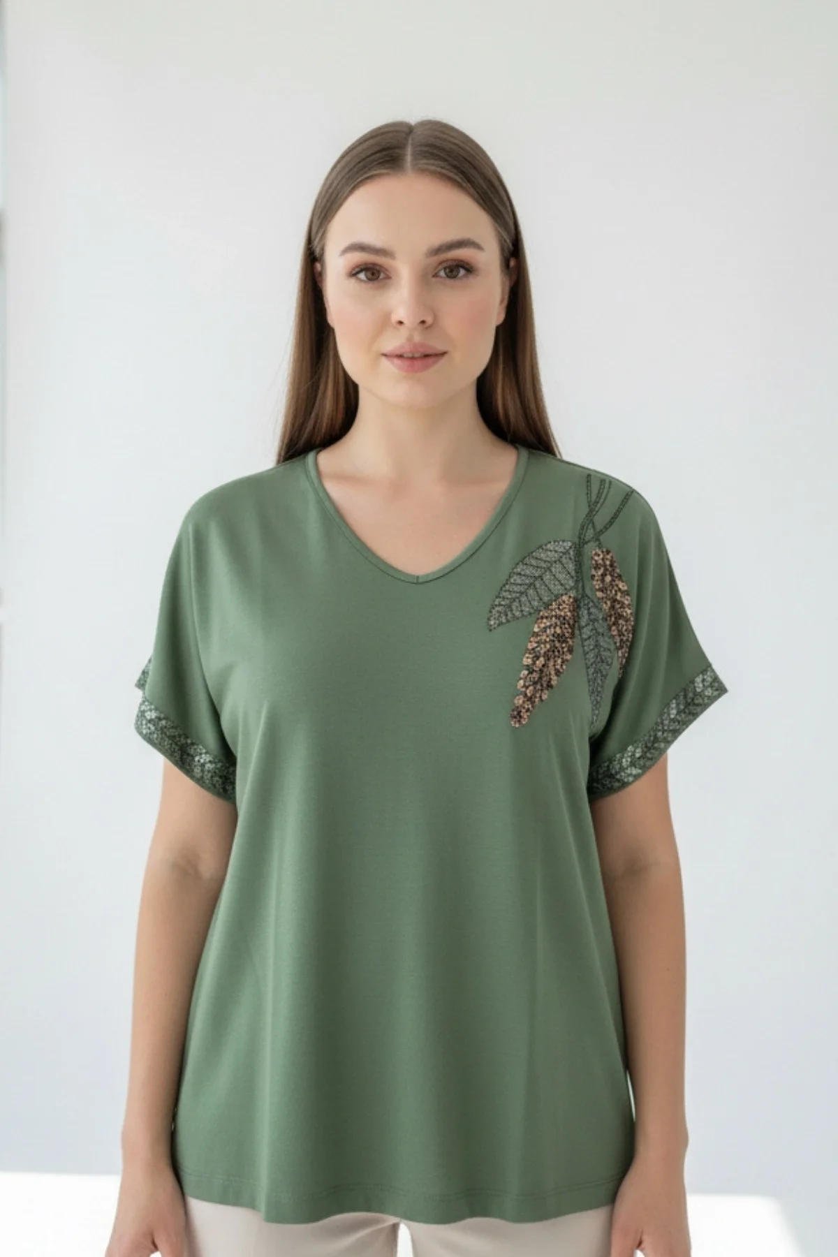 Kadın HAKİ YEŞİL Bisiklet Yaka Büyük Beden Yakası Taş İşlemeli Likralı Buluz