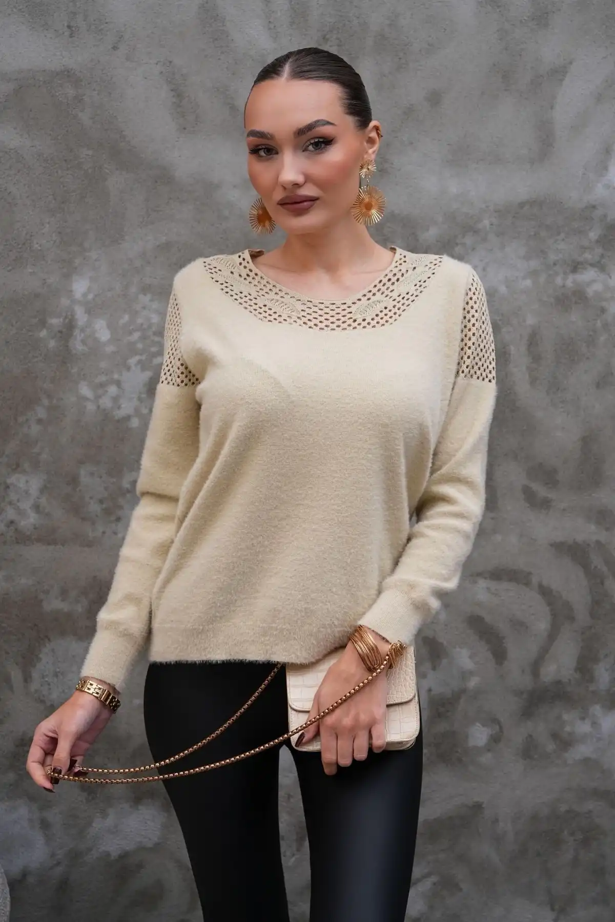 Kadın Bej Yumoş Tiriko Sakal İp Örgü Likralı Yaka Ve Omuz File Detaylı Liralı Kazak