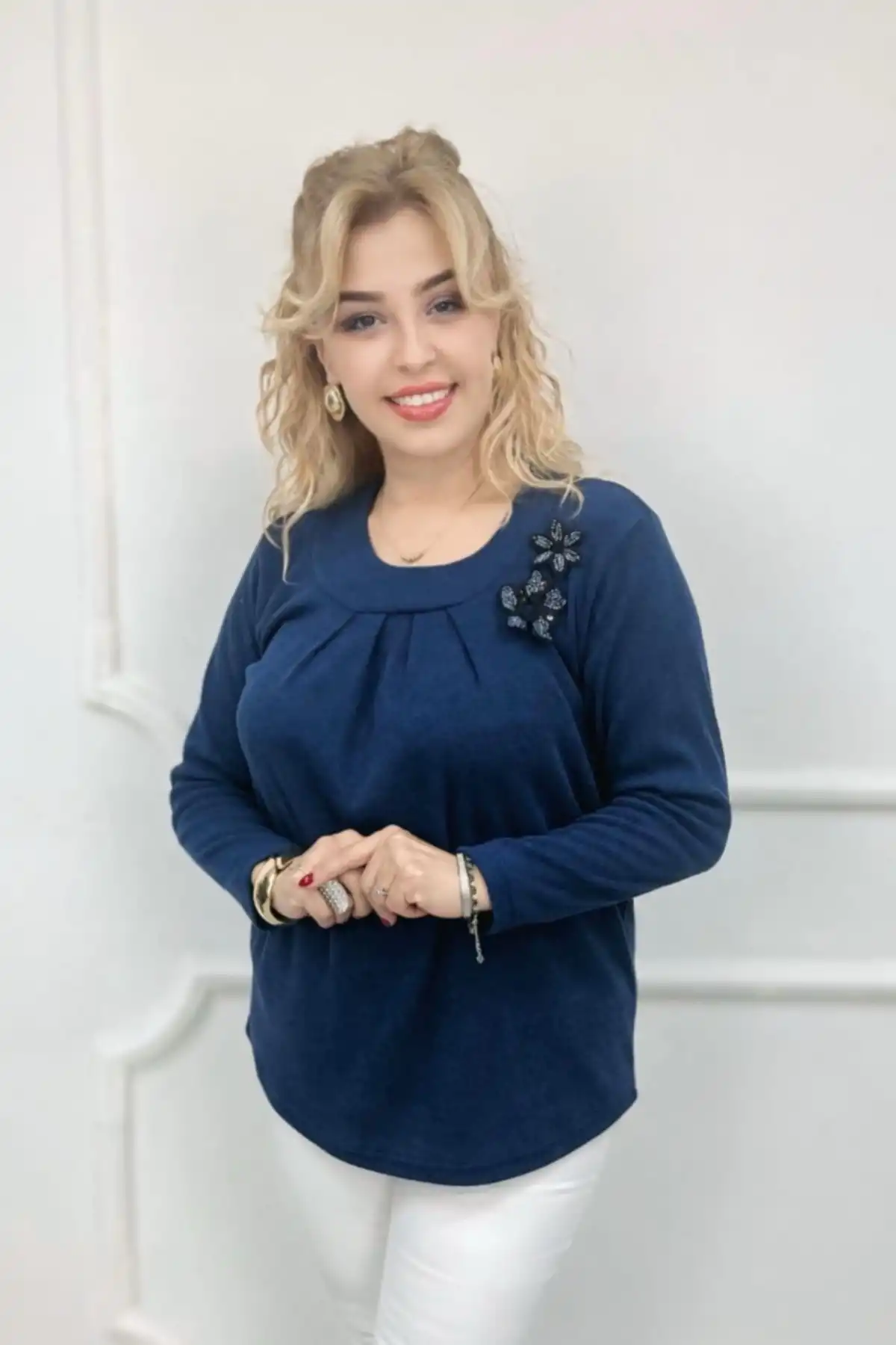 Kadın Lacivert Bisiklet Yaka Büyük Beden Yakası Pileli Likralı İnce Tiriko Buluz