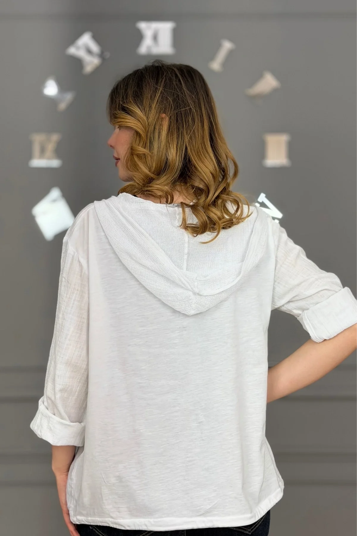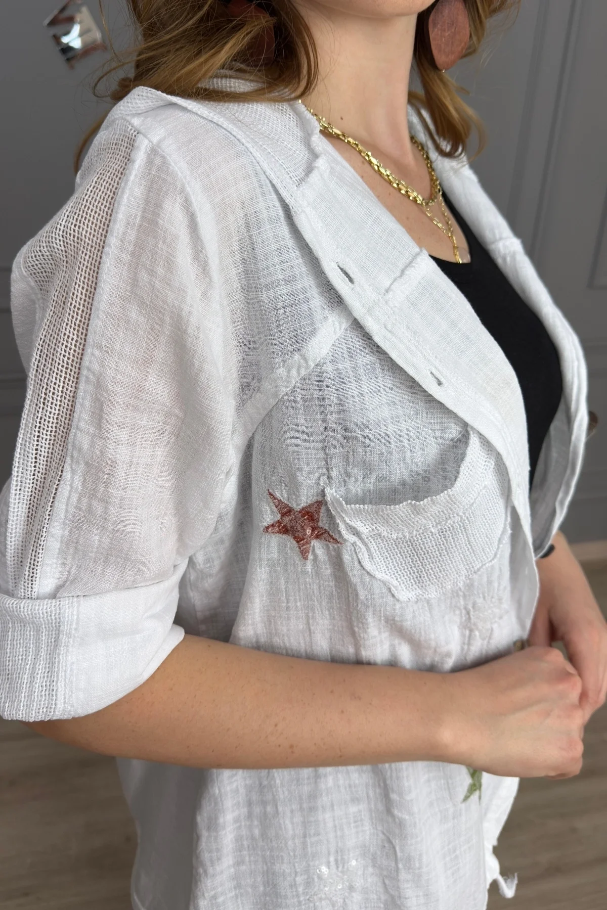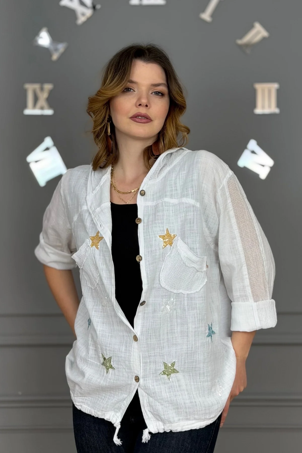 Kadın BEYAZ Organik Yıkamalı Keten Kumaş Arkası Pamuk Penye Kapüşonlu File Ve Yıldız Pul Nakışlı Gömlek Ceket