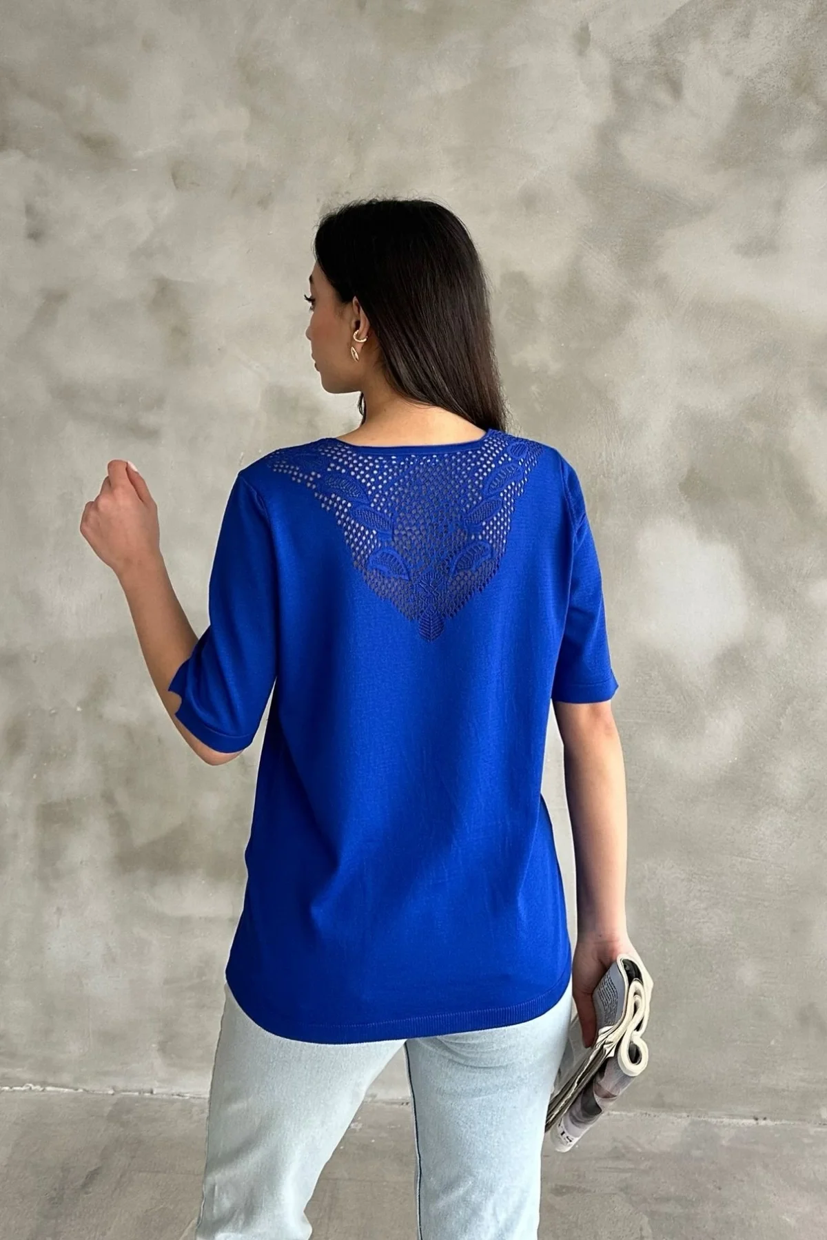 Kadın Mavi V Yaka Yakası Ve Sırtı Detaylı Soğuk İpilik Merserize Likralı Buluz