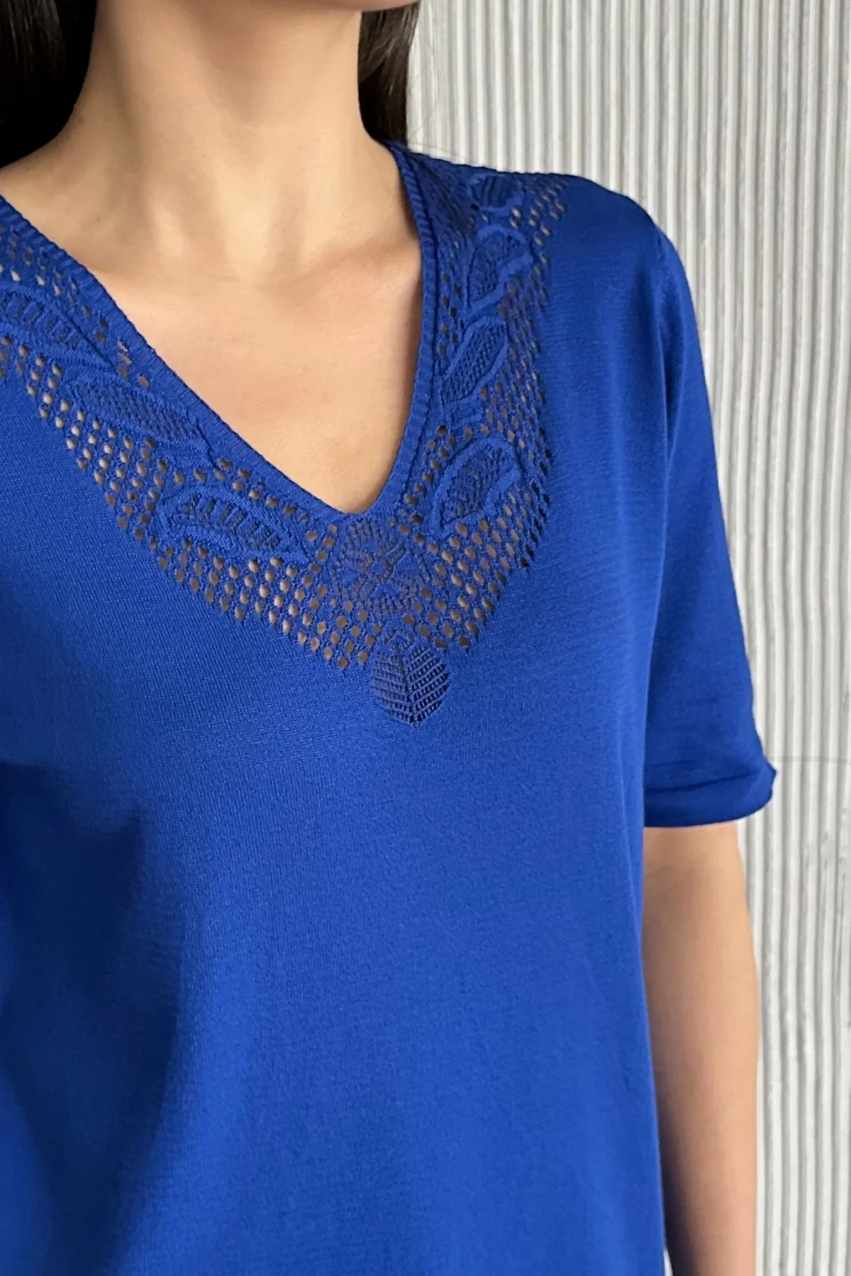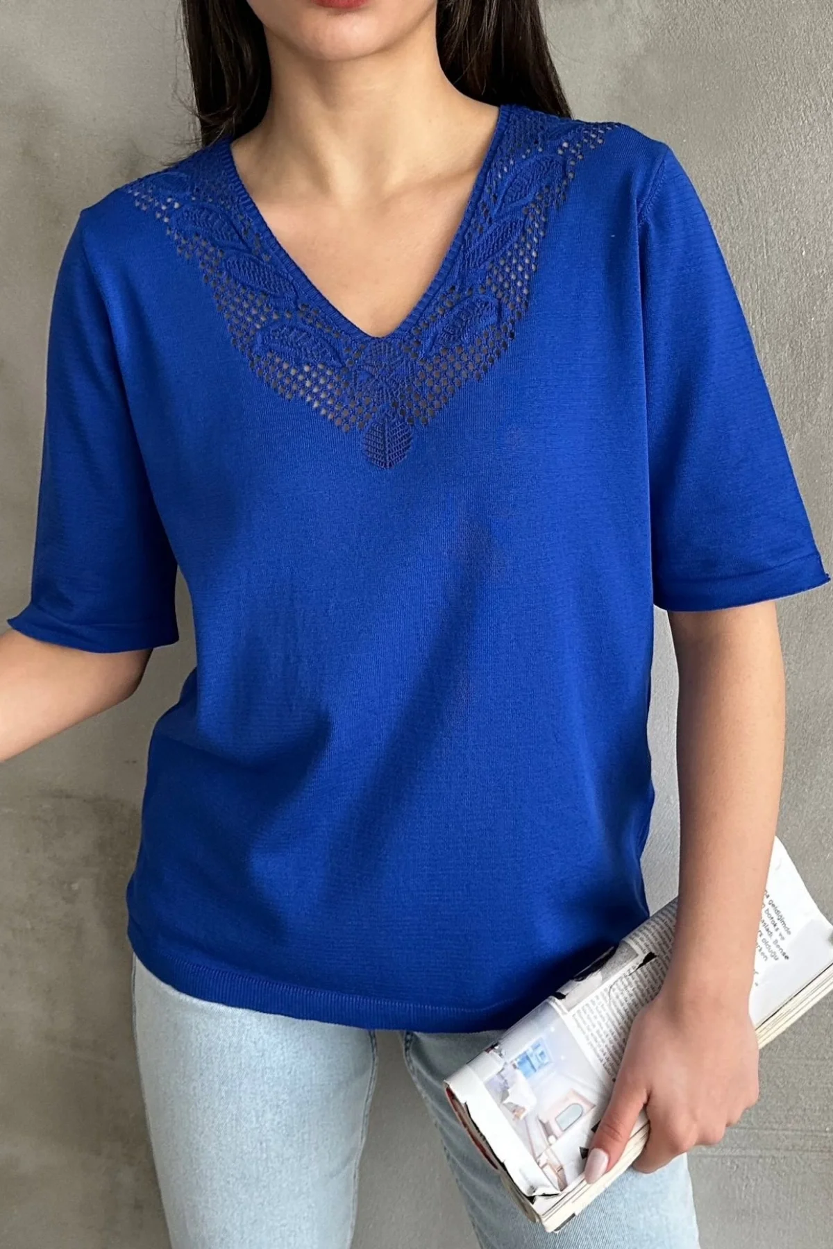 Kadın MAVİ V Yaka Yakası Sim Detaylı Soğuk İplik Yazlık İnce Merserize Buluz