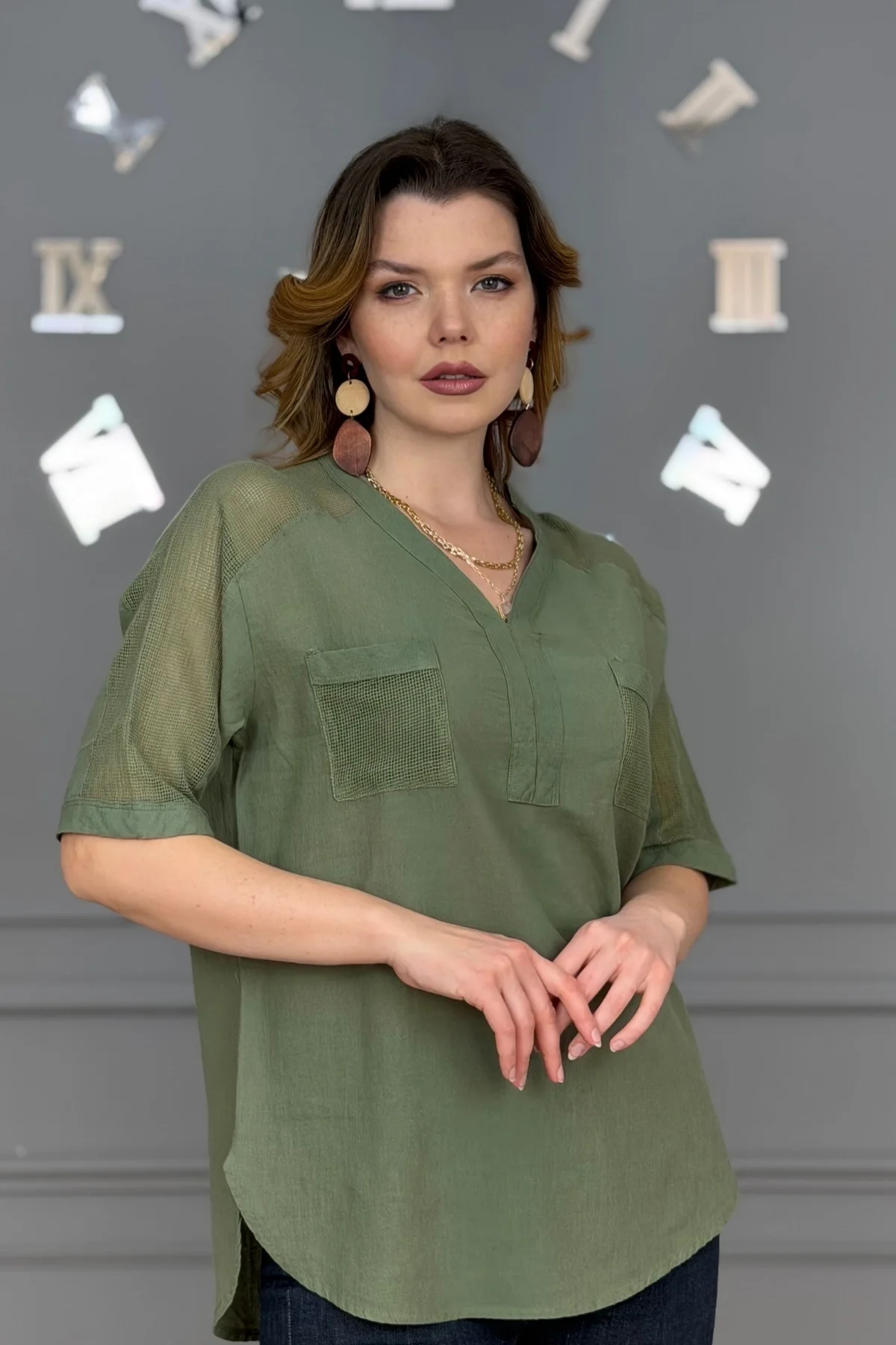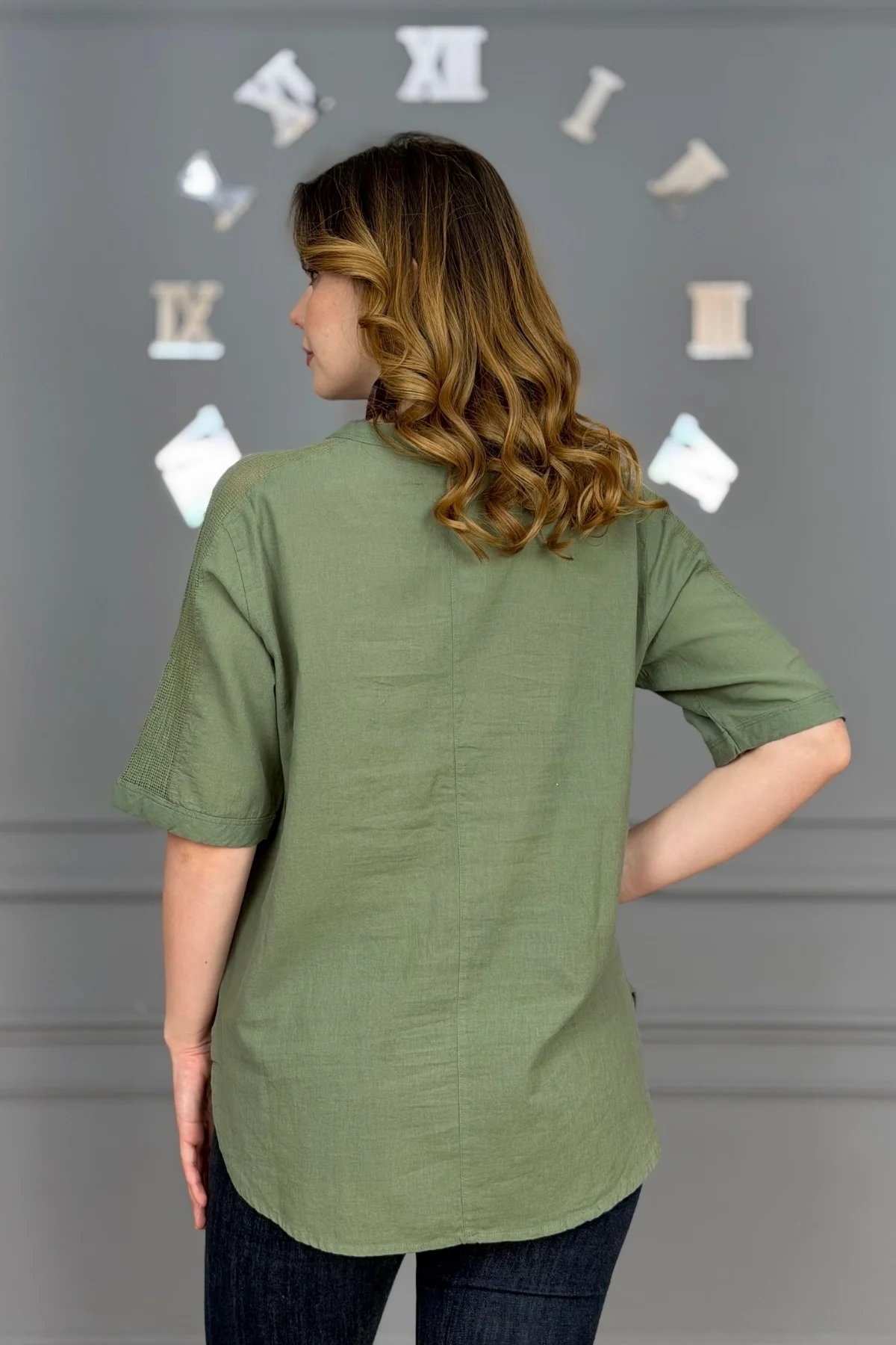 Kadın HAKİ YEŞİL Yıkamalı Organik Pamuk Keten Kumaş Omuz Ve Cebi File Detaylı Dirsek Kol TUNİK Gömlek