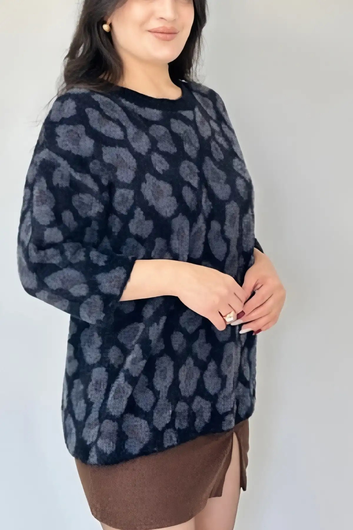 Kadın Lacivert Bisiklet Yaka Desenli Angora Sakal Yumoş İp Örgü Rahat Kalıp Tiriko Kazak