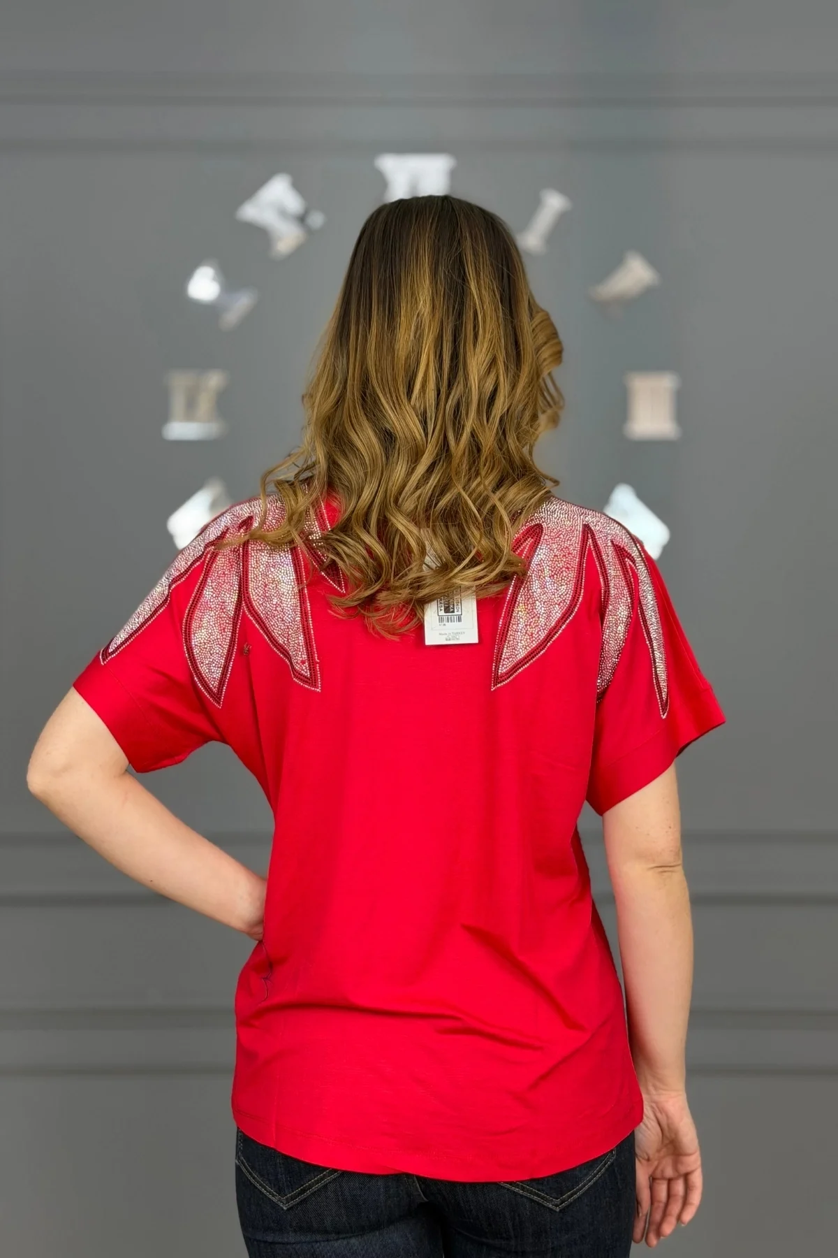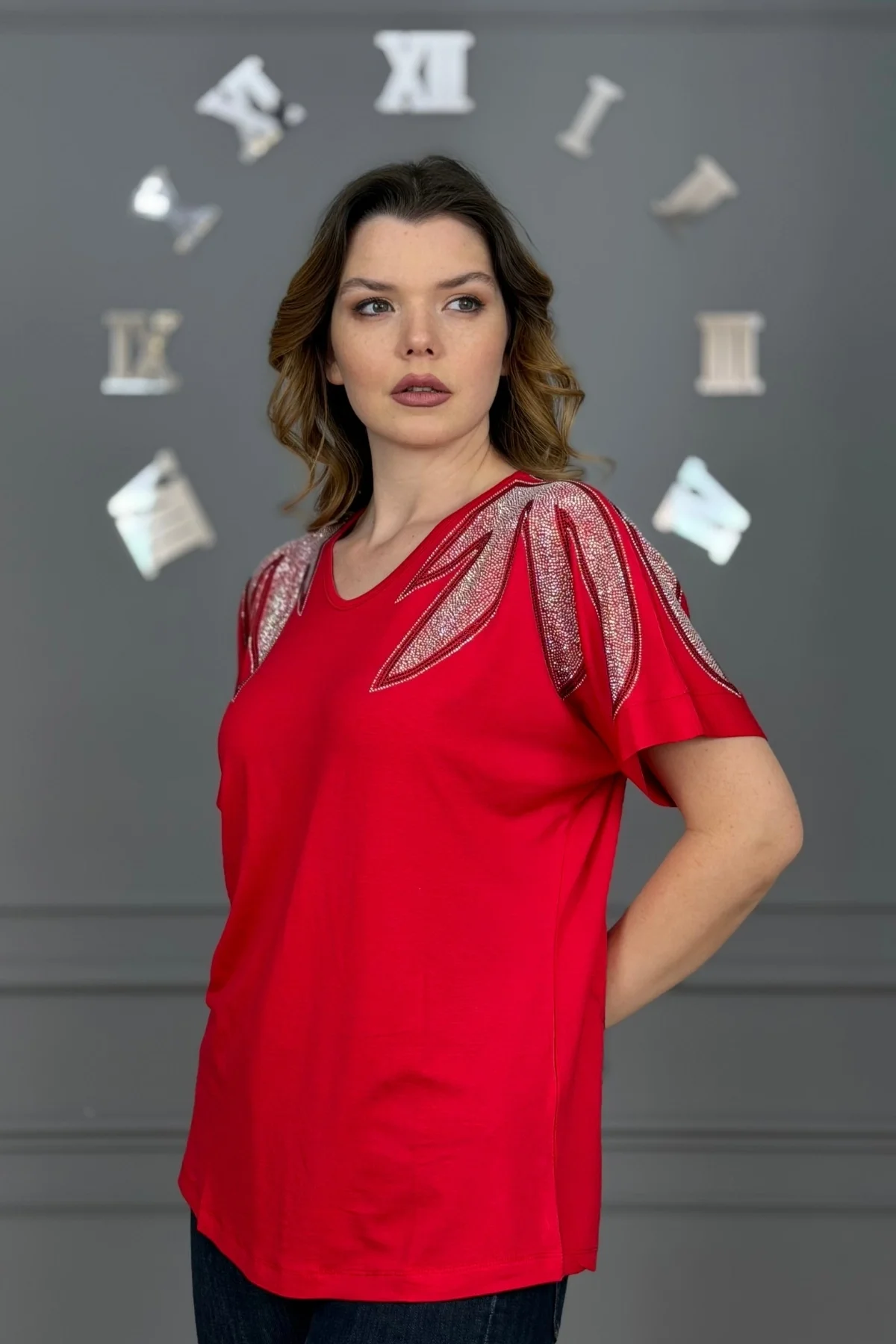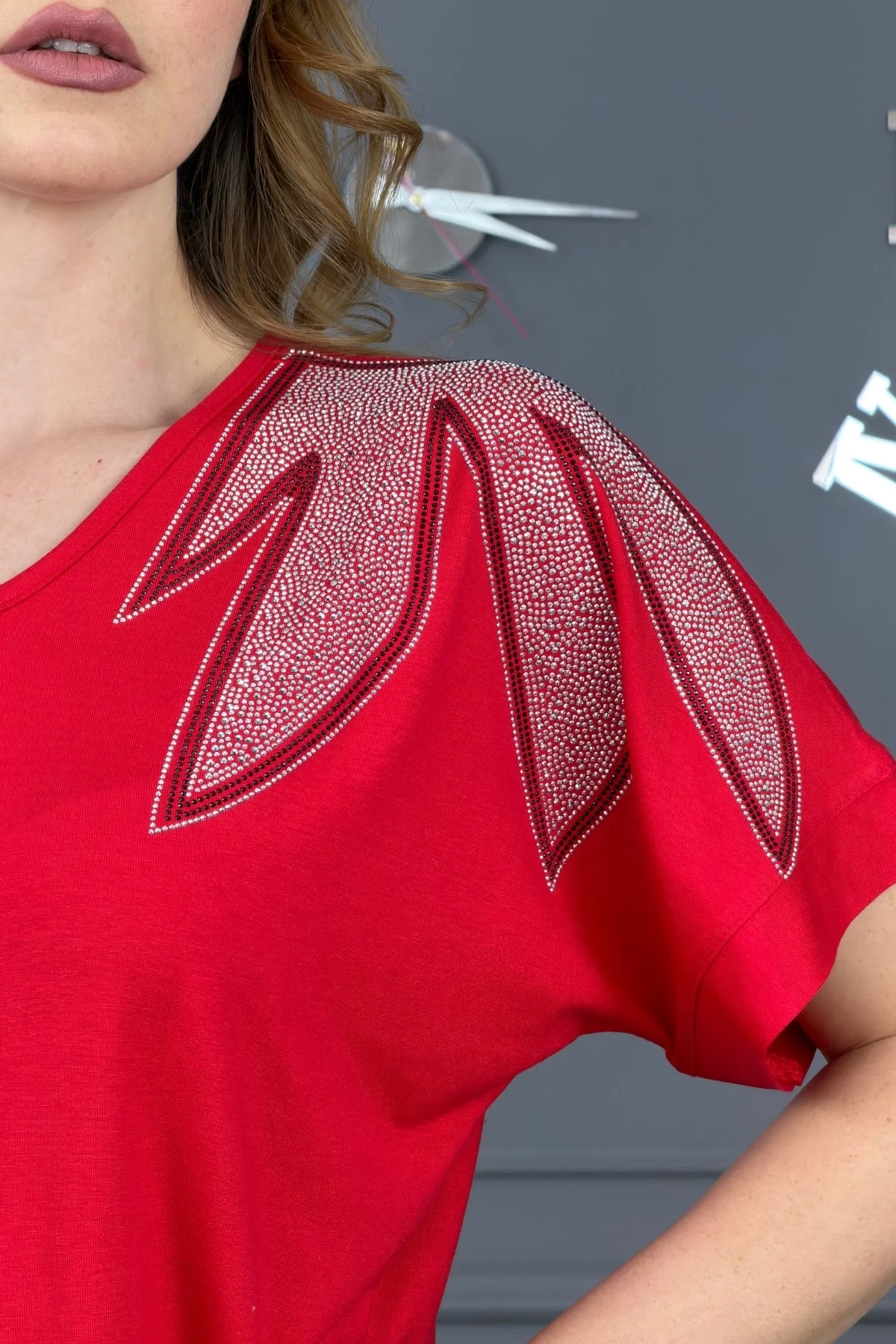 Kadın Kırmızı Büyük Beden V Yaka Omuzlar Yaprak Kristal Taş İşlemeli Likralı Kısa Kol Buluz